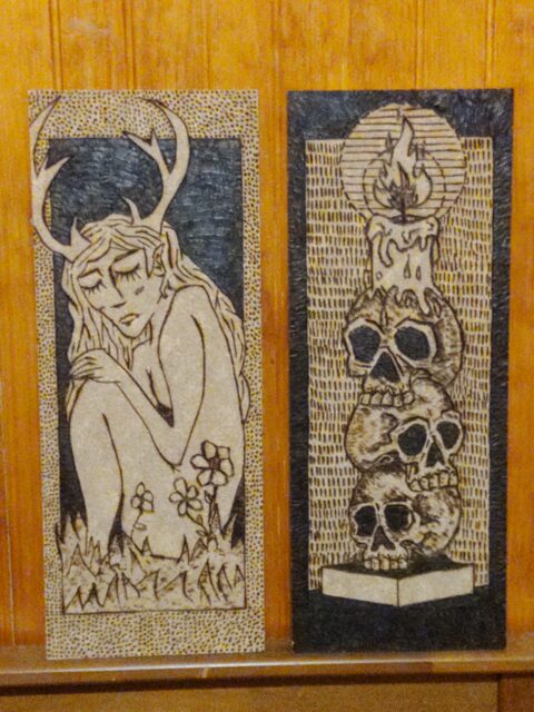 Arte de pirograbado sobre madera reciclada, entregando una segunda vida a madera a través del arte de dibujar y pintar quemando sobre tablas de diferentes tipos de maderas y formas.