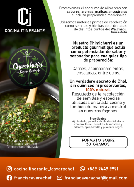 Soy chef y gestora cultural, dedicada al rescate de sabores y a su vez a compartirlos a través de capacitaciones técnicas, cocinas en vivo y reciente en mis plataformas digitales como es Yt, donde cree Alimento Cocina Y territorio, serie audiovisual autogestionada, donde realzamos nuestros paisales, nuestra cultura y el entorno donde nos desarrollamos.