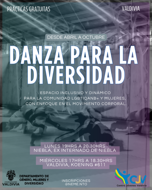 He impartido talleres de danza para diversidades a través del Departamento de Mujer y Diversidad de Género de la Municipalidad de Valdivia, promoviendo la participación inclusiva, la exploración corporal y la expresión artística en colectivos diversos.