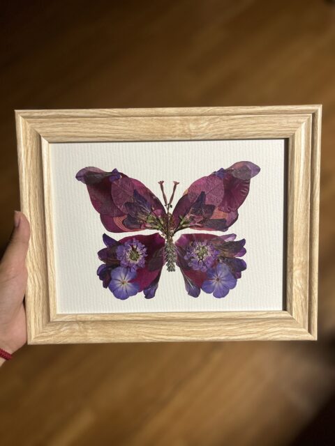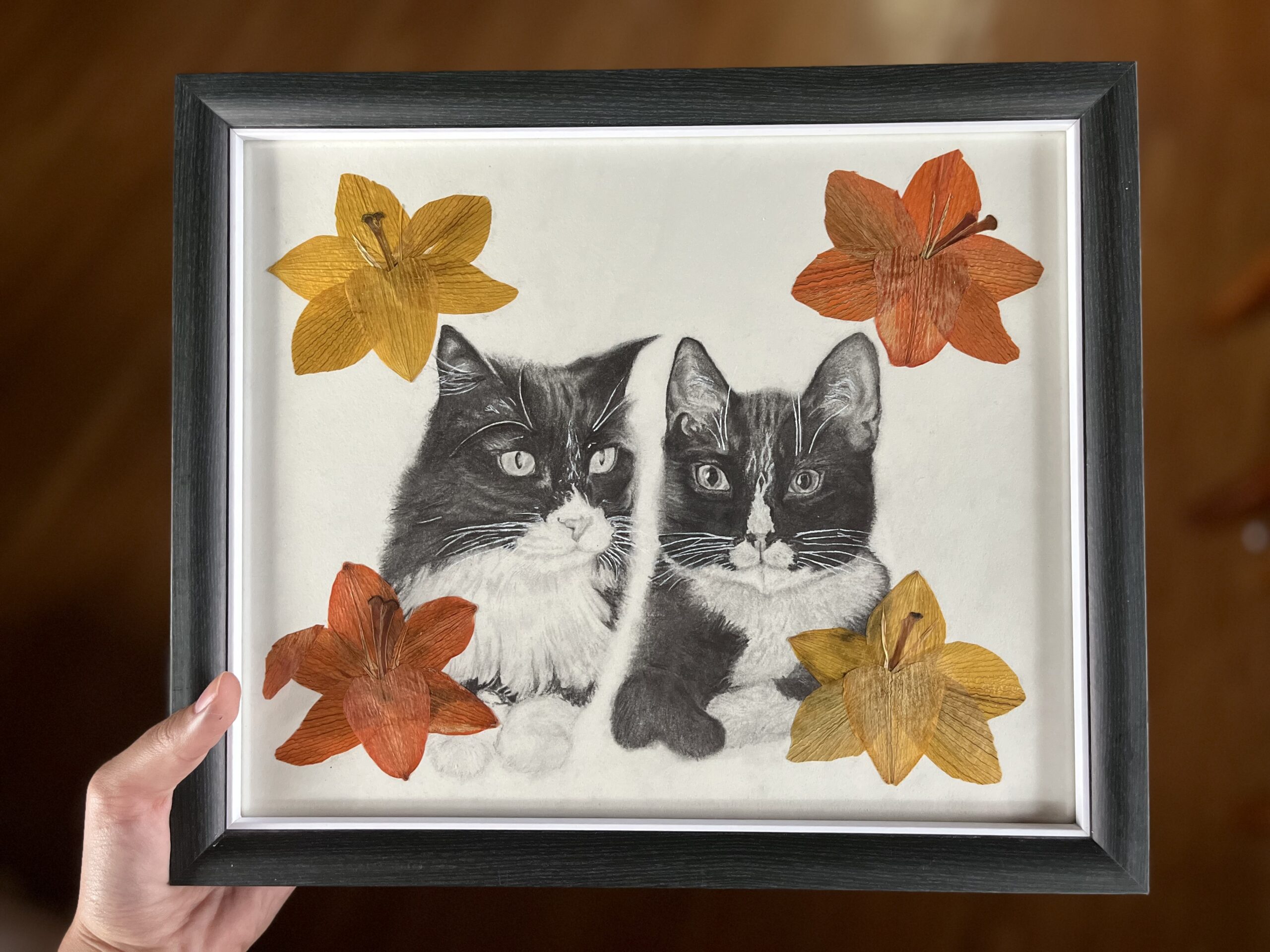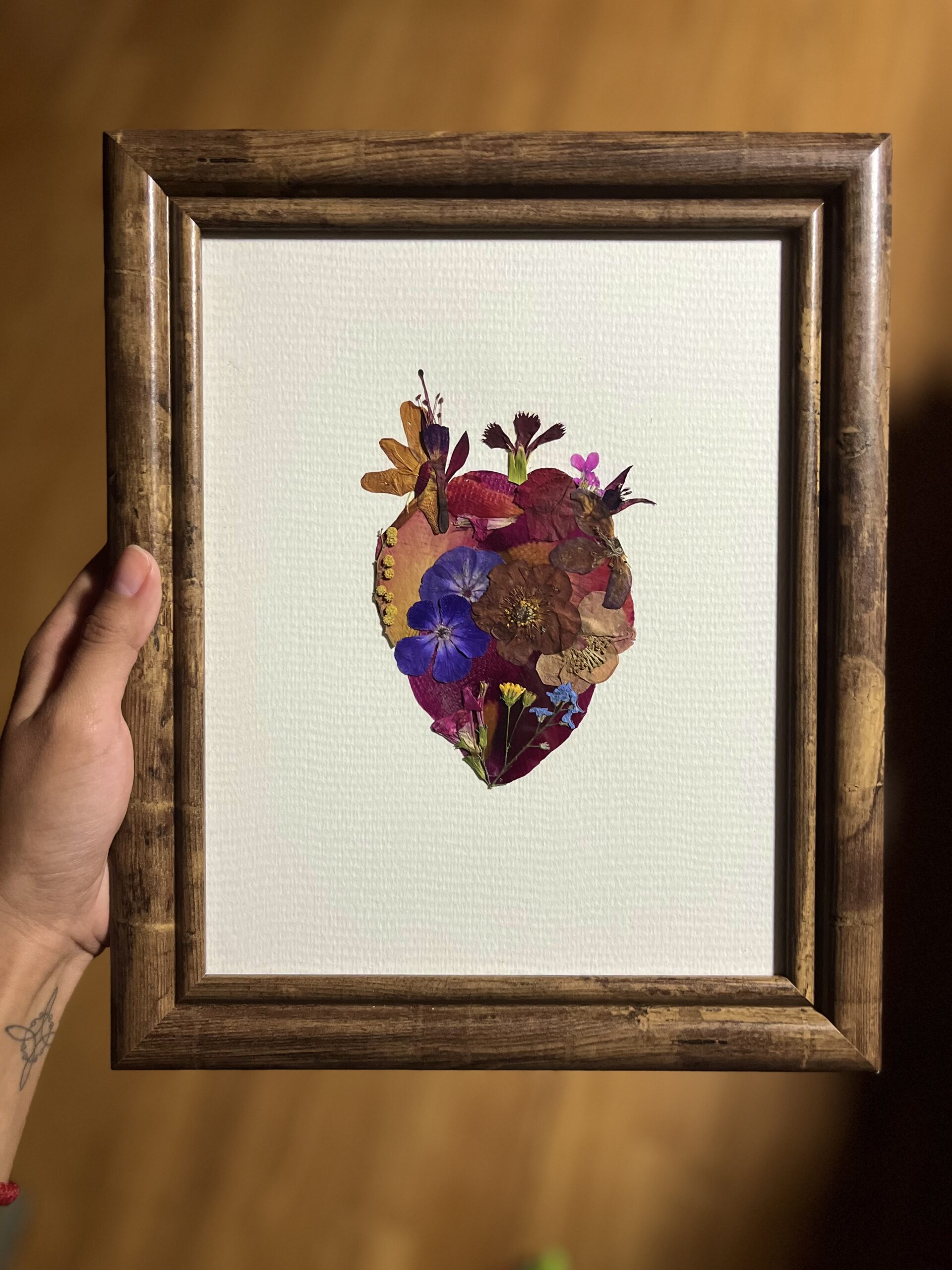 Mi trabajo contempla tanto obras personalizadas por encargo como diseños de autor. En el caso de los retratos, mi enfoque está en capturar la identidad y el vínculo emocional del retratado. En el arte botánico, trabajo con flores naturales, respetando los tiempos del proceso de prensado y cuidando cada etapa de selección, composición y montaje.
