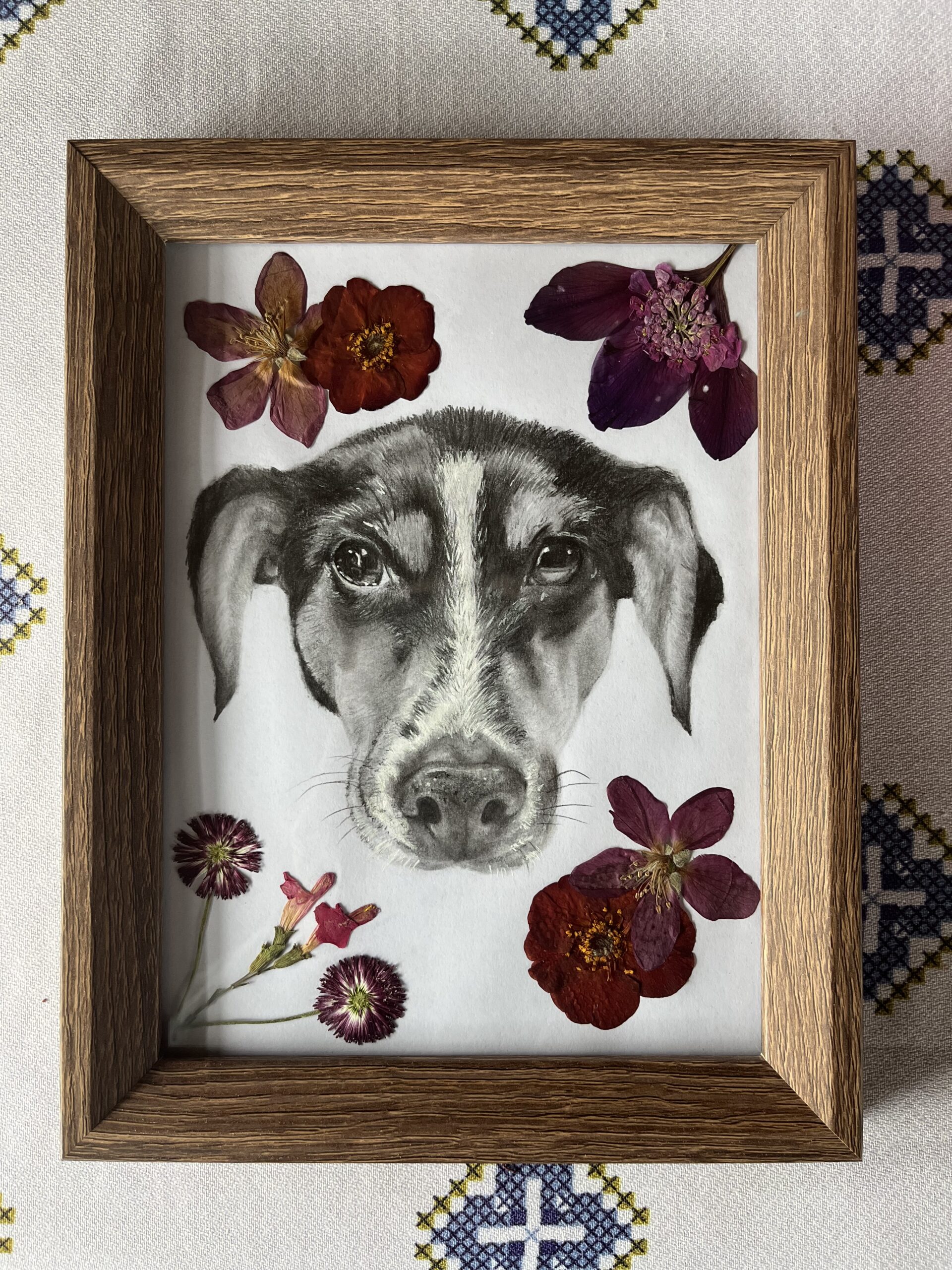 Ofrezco retratos personalizados en acrílico y grafito de personas y mascotas; cuadros y piezas de arte botánico realizados mediante prensado de flores naturales; obras de autor y diseños propios; y servicios de diseño artístico personalizado, adaptados a los requerimientos y relatos de cada cliente.