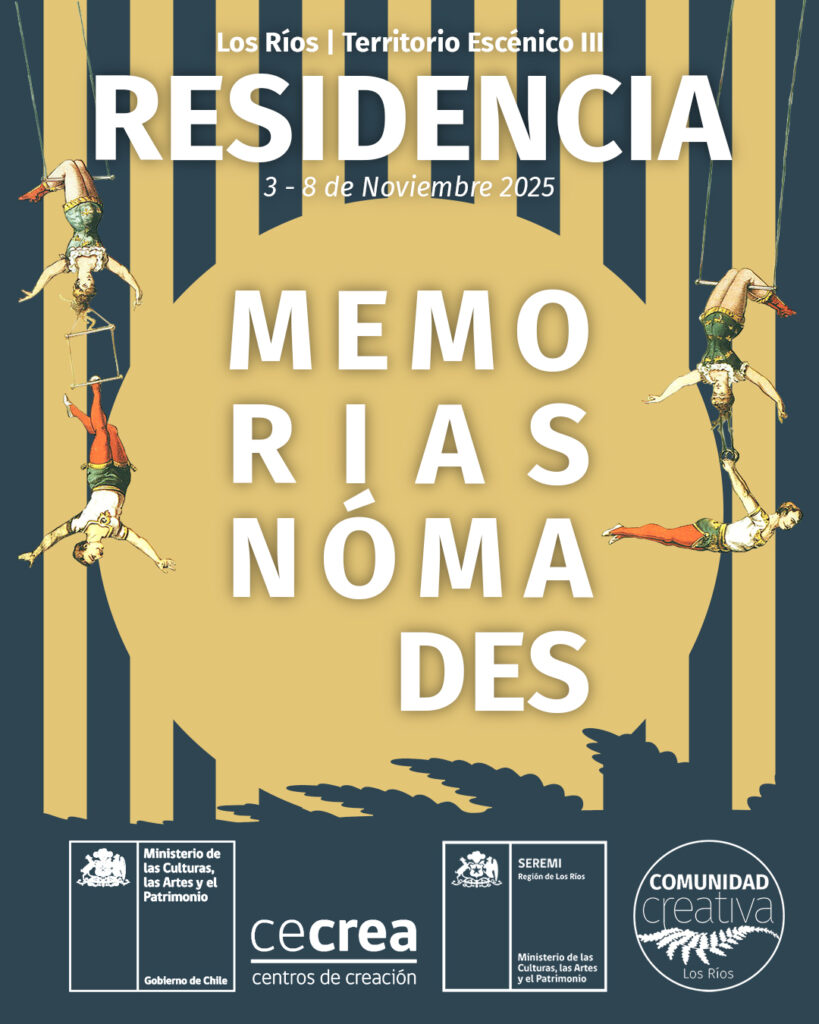 La residencia “Memorias Nómades” es uno de los ejes del programa Los Ríos Territorio Escénico, que se desarrollará del 3 al 7 de noviembre del 2025 en CECREA Valdivia, y se proyecta como un espacio intensivo de diálogo, aprendizaje y creación colectiva con foco en las artes circenses y sus cruces con otras disciplinas escénicas y performativas. Durante el proceso se explorarán las dimensiones del tiempo, memorias y futuro, resignificando la historia y la arquitectura local para transformarlas en un portal escénico interdisciplinar que integra distintos lenguajes, estéticas, medios, sonoridades y visualidades. Para esta versión se disponen de 10 cupos dirigidos a personas naturales que se desempeñan en las artes circenses y disciplinas relacionadas, como marionetas, arte callejero, clown entre otras, en diálogo con investigadores/as, docentes y agentes locales vinculados a la creación.
