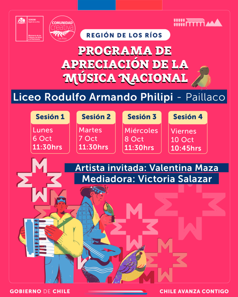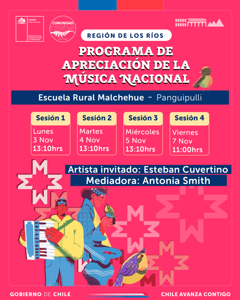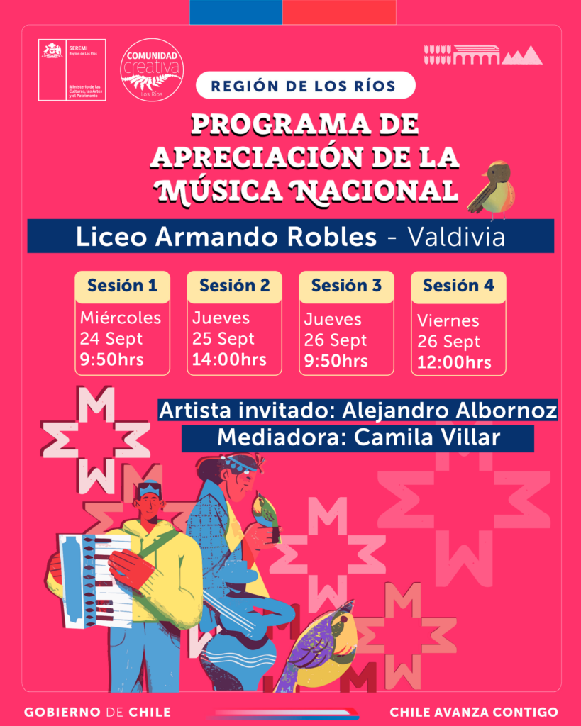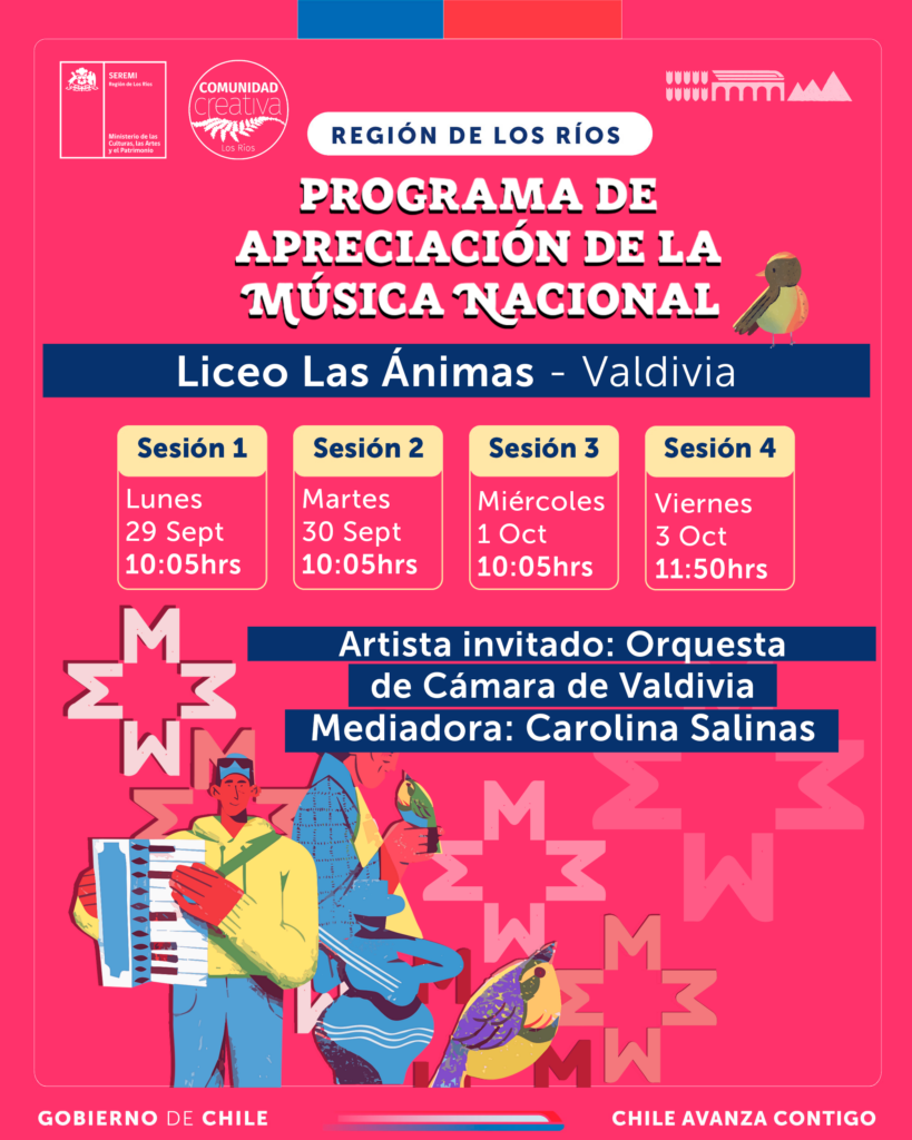 El Programa de Apreciación de Música Nacional (PAM), impulsado por el Ministerio de las Culturas, las Artes y el Patrimonio, comenzó una nueva versión en la Región de Los Ríos. Una abundante agenda de mediaciones artísticas y conciertos se llevará a cabo en 12 establecimientos educacionales de cuatro comunas con el objetivo de acercar la música chilena a estudiantes y comunidades, fomentando su valoración y conocimiento.