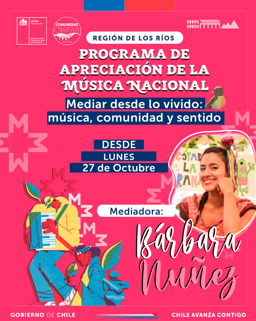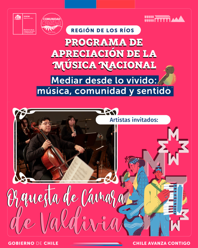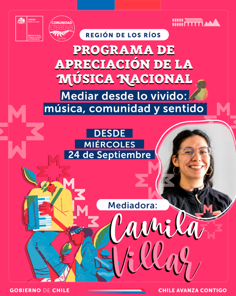 La mediadora de este programa es Camila Villar, violinista de la Orquesta Filarmónica de los Ríos y la Orquesta de Cámara del Centro Cultural de Osorno, tallerista y monitora en diversos espacios de formación.