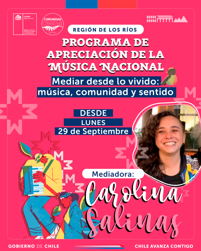 La mediadora de este programa es Carolina Salinas @carosalinasmusica, intérprete musical, compositora y educadora artística. Desde su debut como solista en el año 2021, ha participado en festivales y ciclos de música en escenarios como Matucana 100, Teatro del Lago y el FICValdivia componiendo y musicalizando propuestas musicales a dúo con el baterista Daniel Meneses.