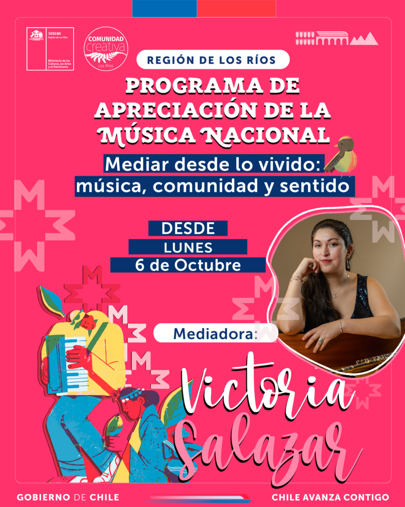 La mediadora de este programa es Victoria Salazar @vickyflau_ quien es intérprete formada en el Colegio Bicentenario de Música Juan Bach y en el Conservatorio de Música UACh. Flautista y coordinadora de la Orquesta Filarmónica de Los Ríos en Chile, también es parte del Dúo Viconti, la banda Entre Rulos y aparte del equipo de Valdivia Master Class.