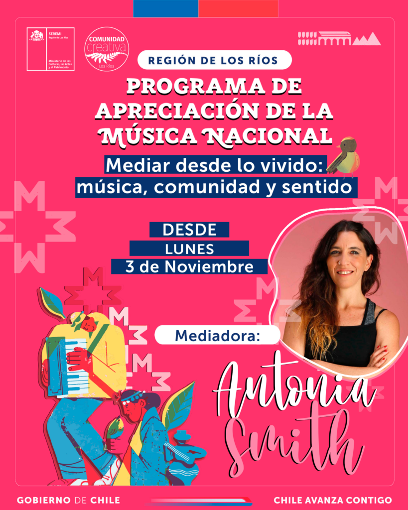 La mediadora de este ciclo es Antonia Smith, cantante, autora, instrumentista y educadora. Ha realizado trabajos de música para niños, con temáticas de medioambiente y mitos/leyendas latinoamericanas en diferentes establecimientos, además de participar como mediadora en el programa Programa de Apreciación de la Música Nacional (PAM) desde el 2023, haciendo mediaciones en establecimientos escolares.