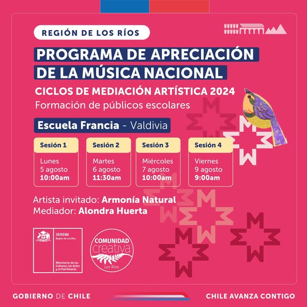Serán un total de 10 ciclos en diferentes establecimientos educacionales. Este lunes 05 de agosto se inició la primera instancia de apreciación junto a la mediadora Alondra Huerta, destacada pianista y profesora de música, quien acercará a niños y niñas de la Escuela Francia de Valdivia a la música de Armonía Natural!