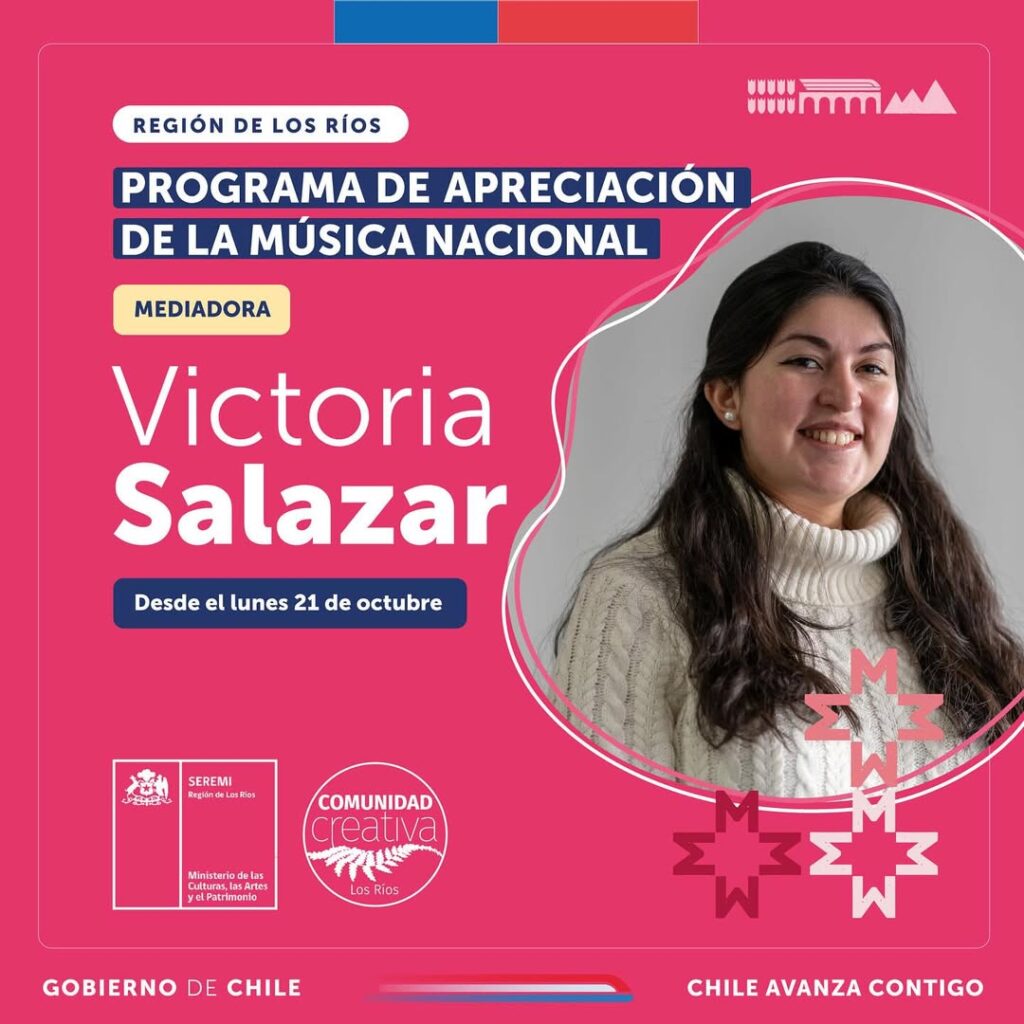 🌿 El proceso de mediación estuvo a cargo de Victoria Salazar, reconocida flautista y gestora cultural. Victoria comenzó su formación musical a los 8 años en el Colegio de Música Juan Sebastián Bach, en Valdivia, y continuó sus estudios en el Conservatorio de Música de la Universidad Austral de Chile, donde se tituló en 2022. Su amplia experiencia incluye participaciones en encuentros y festivales en Chile y en el extranjero, destacándose en países como Alemania, Italia y Francia, entre otros.