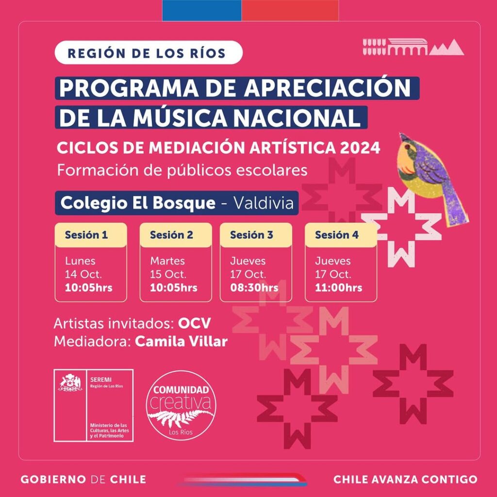 👉🏽🎻 El proceso ha sido mediado por Camila Villar destacada música de la región de Los Ríos que ha dedicado su vida tanto a la interpretación como a la enseñanza musical. Miembro de la Orquesta Filarmónica de los Ríos y de la Orquesta de Cámara del Centro Cultural de Osorno, ha explorado desde la música docta hasta la popular, destacándose en escenarios como el Teatro Municipal de Santiago, el Teatro del Lago en Frutillar y en múltiples giras por Chile y Argentina. Camila ha enriquecido esta experiencia musical llevando a jóvenes de la Escuela El Bosque la música de la OCV.