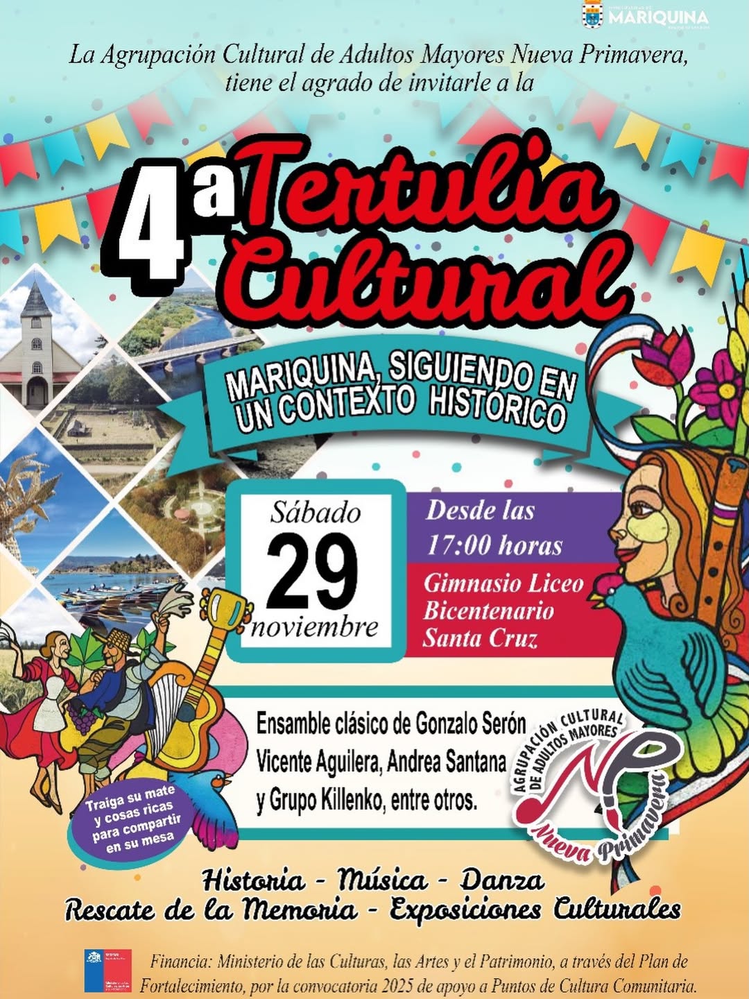 La Agrupación Cultural de Adultos Mayores Nueva Primavera te invita a disfrutar de una nueva versión de la Tertulia Cultural: “Mariquina, siguiendo en un contexto histórico”, un espacio dedicado a la memoria, la música, la danza y nuestras tradiciones 📖✨