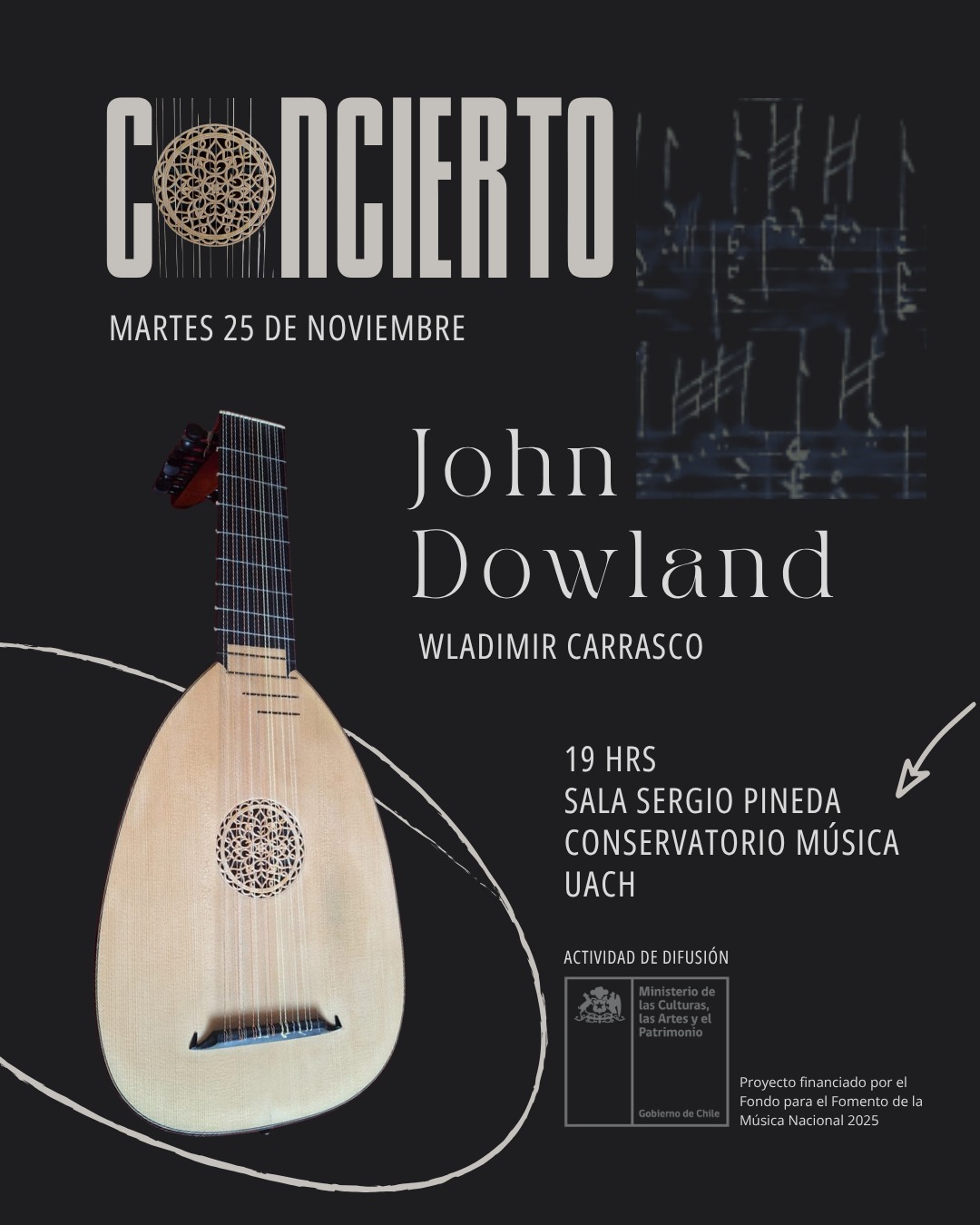 Wladimir Carrasco Moscoso, académico de la Universidad Austral de Chile, tiene el agrado de invitarles al concierto de difusión del proyecto discográfico “Retratos femeninos en la música de John Dowland”, adjudicado en el Fondo de la Música Nacional, Convocatoria 2025.