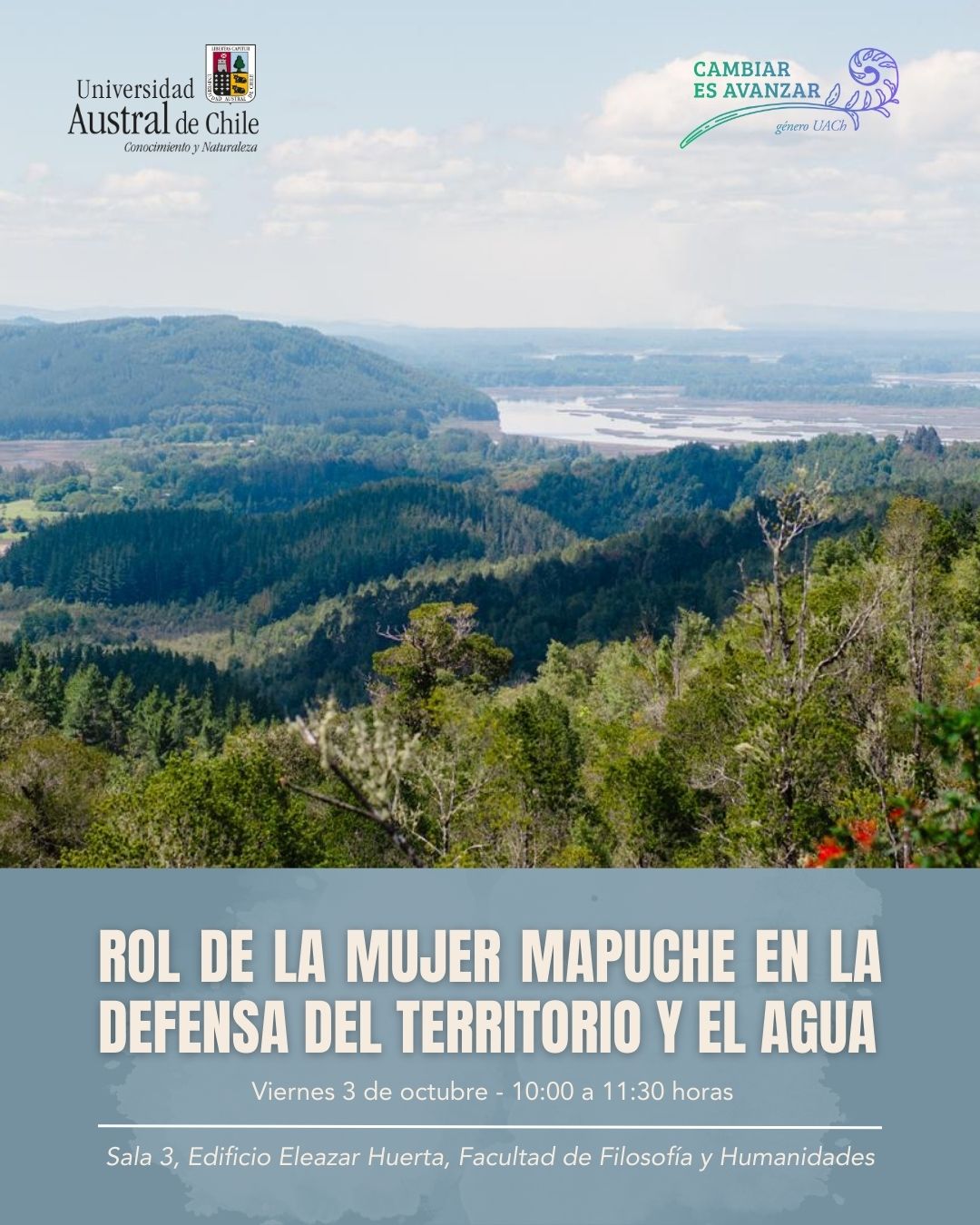 El Programa Cambiar es Avanzar invita a la comunidad universitaria a participar del conversatorio “Rol de la Mujer Mapuche en la defensa del territorio y el agua”, instancia a cargo de la Machi Paola Aroca Cayunao y Pía Chavarría Araya, werken de la de la Comunidad Mapuche Kalfvgen.