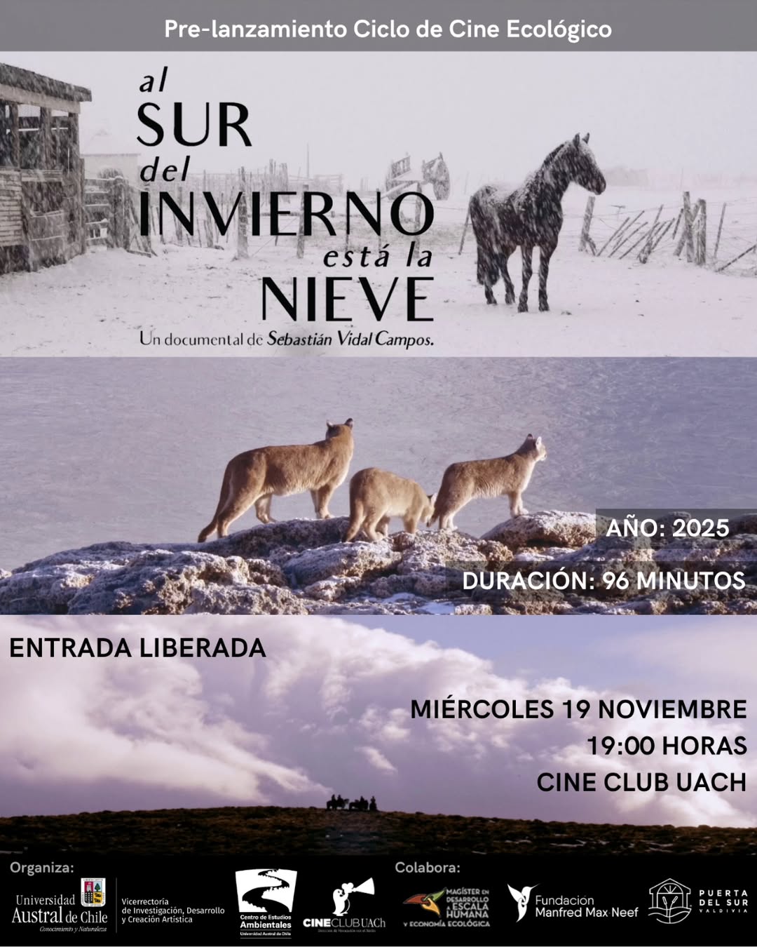 En el marco del Pre-lanzamiento del Ciclo de Cine Ecológico del Ceam-UACh, te invitamos al estreno en Valdivia del documental “Al sur del invierno está la nieve”, una obra que nos acerca a los territorios, saberes y memorias que habitan el crudo invierno en la Patagonia Chilena 🇨🇱.