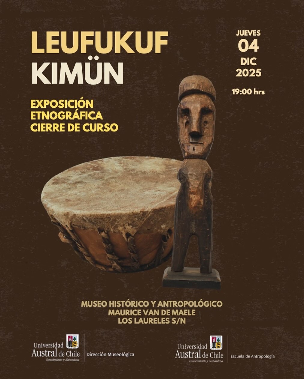 La Dirección Museológica de la Universidad Austral de Chile comparte la invitación a la inauguración de la exposición etnográfica Leüfüküf Kimün, instancia que marca el cierre del curso Introducción a la Museología de la Escuela de Antropología, a cargo del académico y encargado del área de colecciones de la DM-UACh, Roberto Rojas.