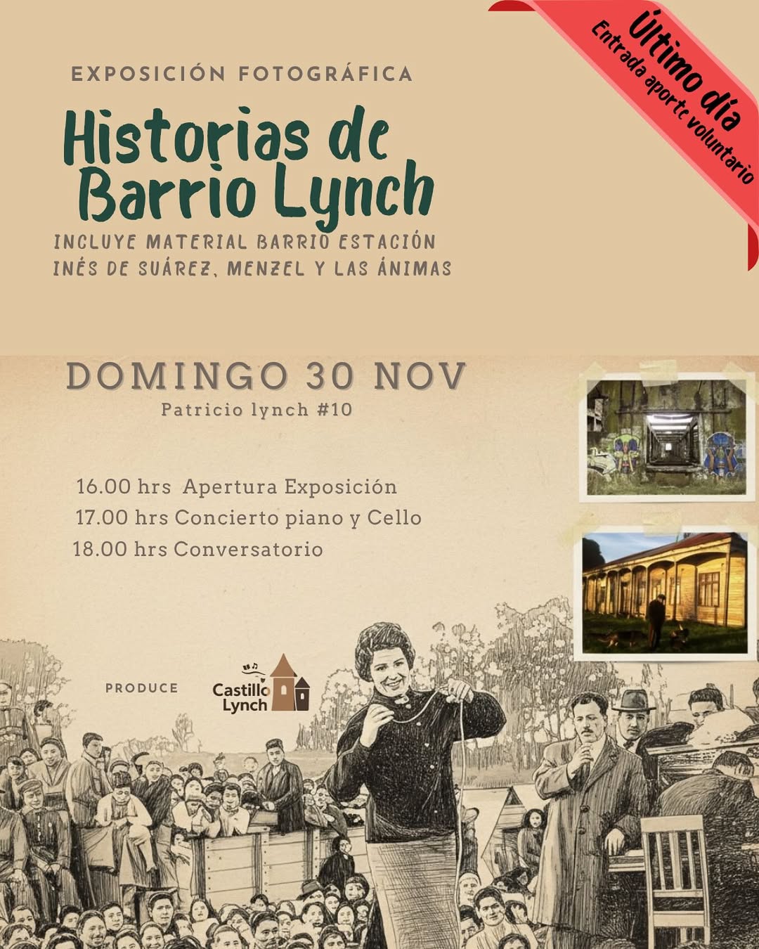 Este Domingo 30 de Noviembre es el evento de cierre y último día para visitar la exposición de fotografías: “Historias de Barrio Lynch” 1858 a 1973. En esta oportunidad tendremos un concierto con una selección de música de la época y un conversatorio.