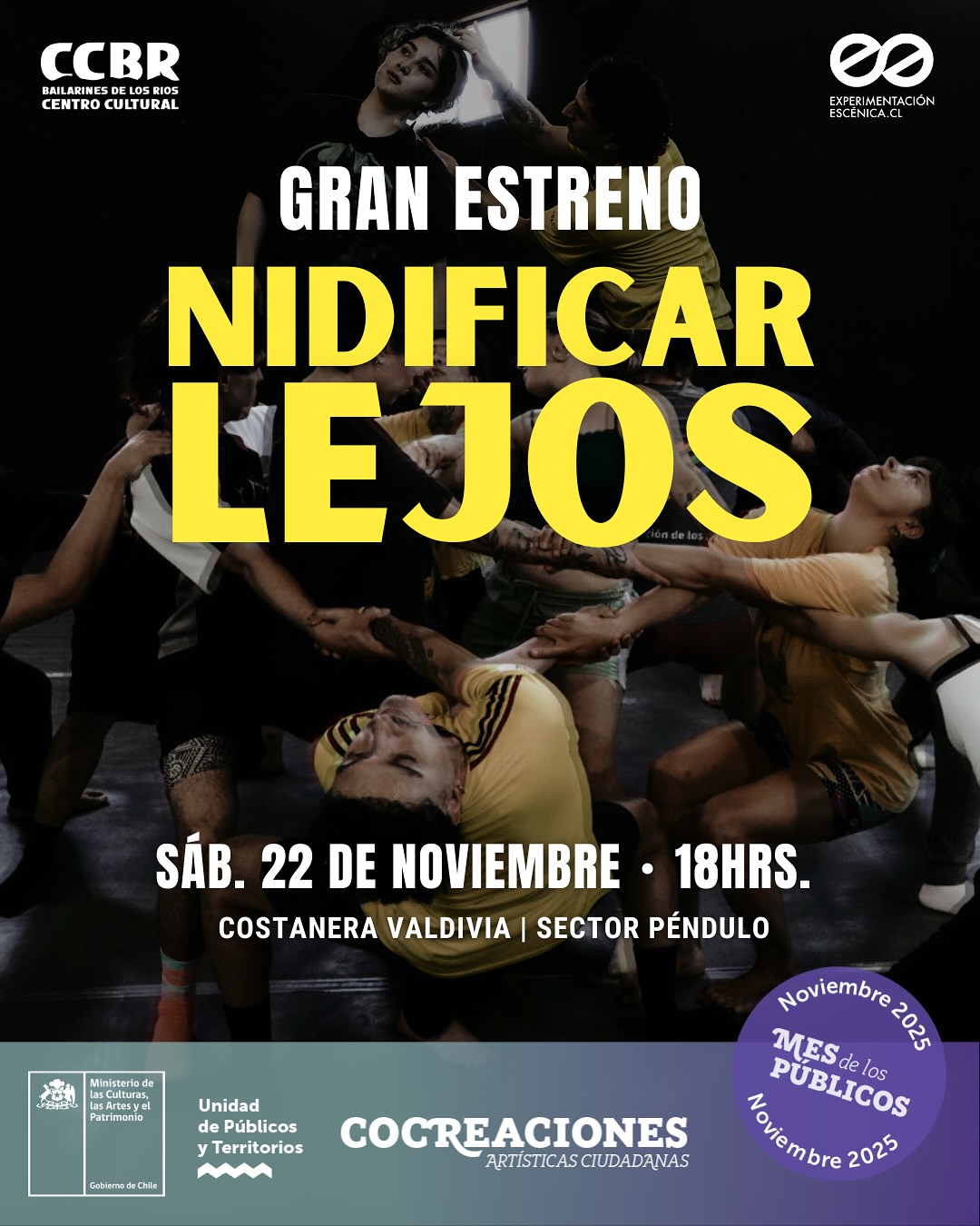 Nidificar lejos es una propuesta de danza contemporánea que aborda los vínculos del tejido social, los afectos y la construcción de futuro en contextos de migración y mudanzas globales. La obra emerge de un laboratorio de cocreación ciudadana desarrollado durante noviembre de 2025, donde habitantes de Valdivia participarán en un proceso colectivo de exploración corporal, memoria y pertenencia. El resultado es una pieza coreográfica que habita el espacio público como un gesto poético de encuentro y arraigo compartido.
