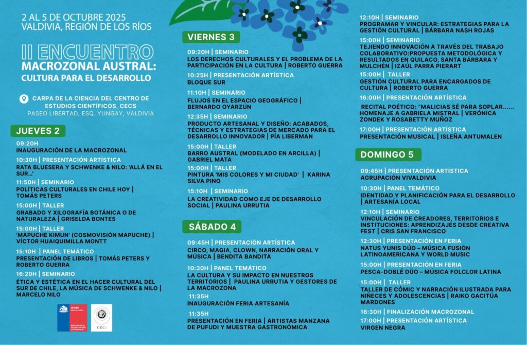 “Tras la realización el año pasado de la primera macrozonal organizada por la Seremi de las Culturas de Aysén, este año Los Ríos toma la posta con un evento que esperamos sea un espacio de encuentro, amistad, colaboración, aprendizaje, reflexión y participación entre representantes de las cuatro regiones del sur austral, en especial sobre los desafíos que enfrenta la cultura en los territorios. Pero además es para nosotros una oportunidad para relevar la creatividad y la economía creativa de Los Ríos y fortalecerla en el intercambio con creadores, creadoras, gestores y gestoras de las otras regiones, y generar redes de interacción”, señaló el seremi de las Culturas Oscar Mendoza.