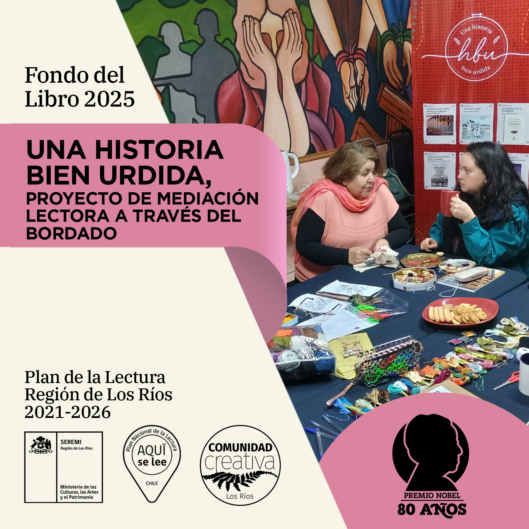Durante este año, “Una historia bien urdida” ha recorrido las comunas de Valdivia y Los Lagos, mediando libros como El sendero de la mariposa de Pedro Guillermo Jara y El ojo atravesado, un epistolario de Gabriela Mistral. Pronto se sumará una nueva mediación dedicada a la música, con un libro de partituras de Víctor Vizcúpovich. En cada encuentro, las y los participantes reciben un set lector-bordador, con su propio libro, bitácora, tela ilustrada, hilos y aguja, un gesto que refuerza el acceso tangible a la lectura y el arte, pensado especialmente en aquellos que no han tenido la oportunidad de que les regalen un libro alguna vez, y que ese primer encuentro puede cambiar mucho más que un hábito.