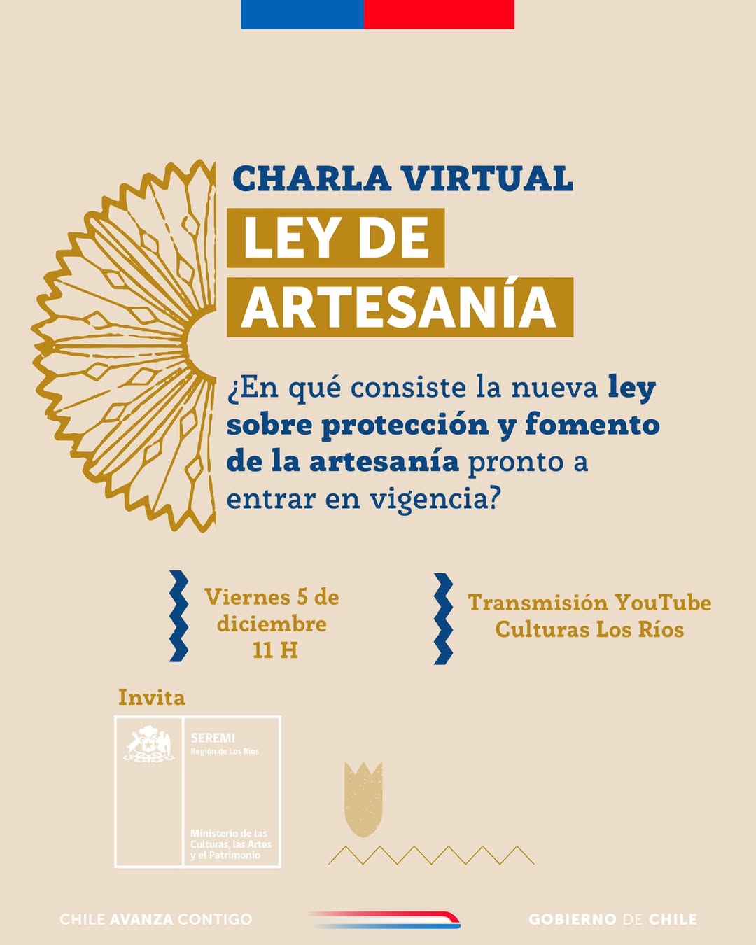 Mediante una charla virtual con profesionales del área de Artesanía del Ministerio de las Culturas te contaremos en qué consiste, qué establece en materia de reconocimientos, instrumentos de participación y apoyo al sector, además de los cambios en el Registro Nacional de Artesanía.