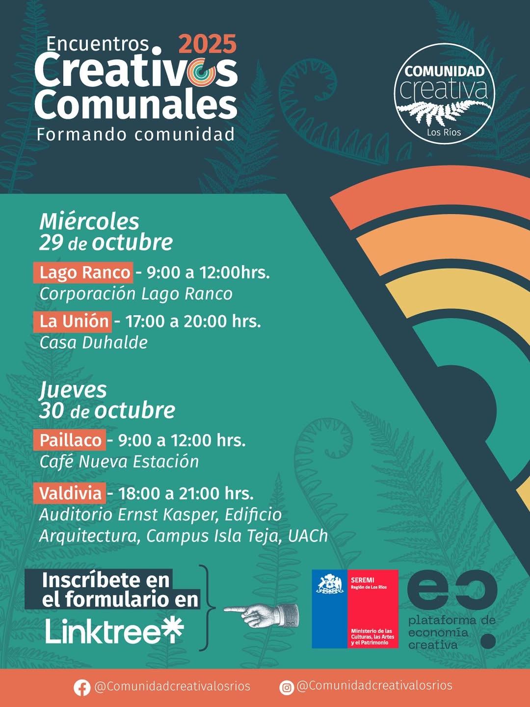 Ven a conocer de qué se trata nuestra plataforma 💻 y todos los beneficios de integrar la Comunidad Creativa Los Ríos en lo que será nuestra tercera gira de encuentros presenciales, una nueva oportunidad para conocernos y seguir fortaleciendo los lazos que sostienen la red creativa regional.